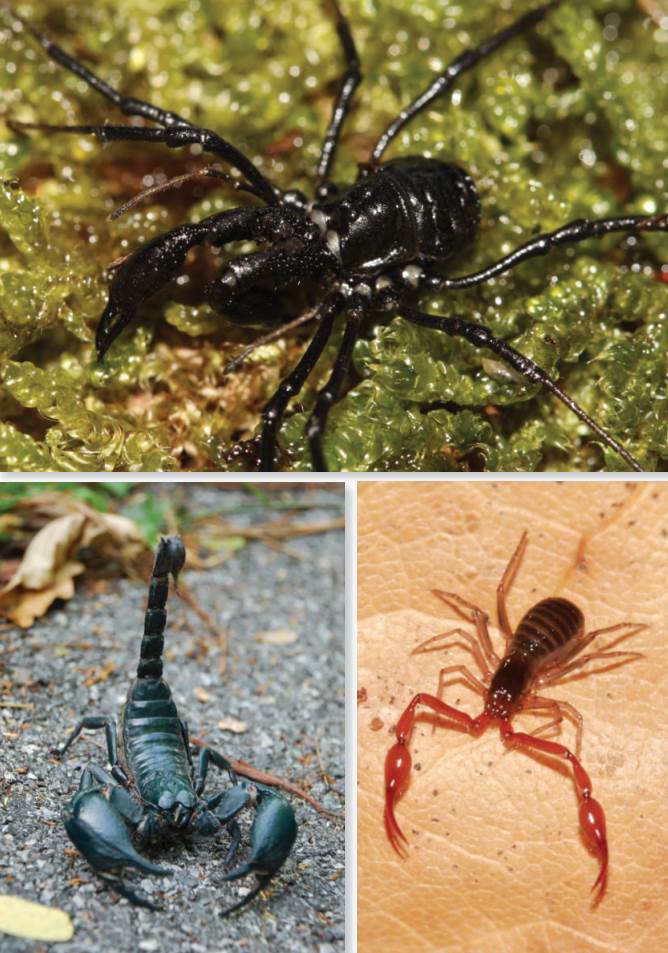 Рис. XIX.IV: На фотографии справа представлен лжескорпион. Это паукообразные с клешневидными педипальпами, но компактным брюшком, в отличие от настоящих скорпионов. Слева для сравнения показан сенокосец Ischyropsalis helwigii.