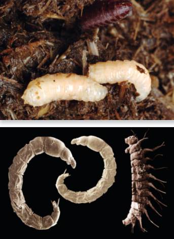 Значительную долю почвенной макрофауны составляют насекомые. Особую экологическую роль играют личинки двукрылых (Diptera), часто называемые почвенными личинками (рис. XIX.V). Их плотность может достигать тысяч особей на квадратный метр. Стратегии питания варьируются от хищничества и паразитизма до сапрофагии. Личинки-сапрофаги являются важнейшими редуцентами, ускоряя разложение мертвого органического вещества.