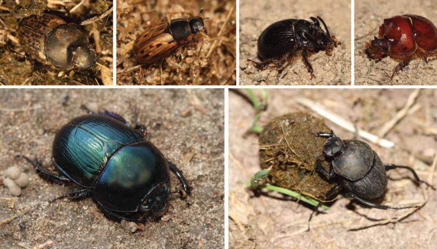 Рис. XIX.VI: Навозные жуки (Scarabaeoidea) играют vital роль в переработке навоза. Европейские виды, представленные на фото: Onthophagus vacca, Aphodius conspurcatus, Bolboceras armiger (самец), Bolbelasmus unicornis (самец), Geotrupes mutator, Sisyphus schaefferi.