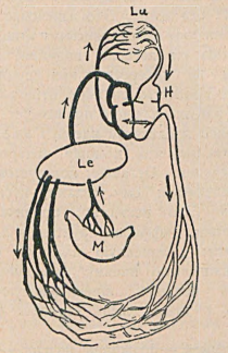 Рис. 61. Схема кровообращения по представлению Галена. Изображение иллюстрирует движение крови и пневмы через печень, сердце и мозг, согласно трёхчастной системе.