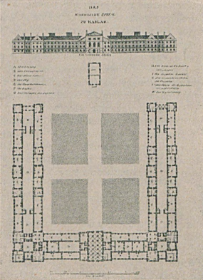 Рис. 148. «Королевский госпиталь в Газларе». Из сочинения Говарда «Больницы и чумные дома в Европе». Лейпциг, 1701 г.