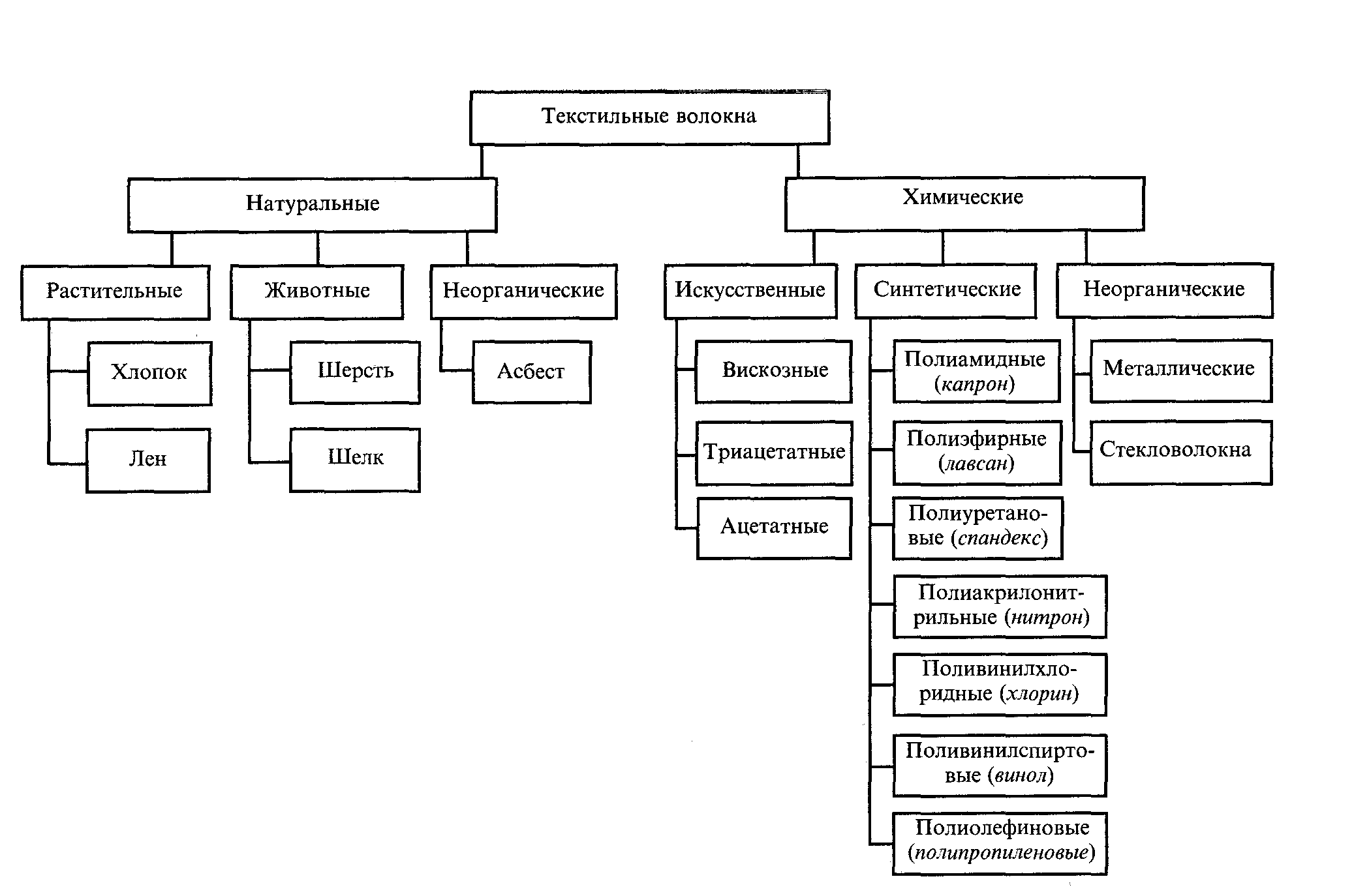 Классификация текстильных волокон основана на их происхождении (см. Рис. 1). Все волокна делятся на натуральные и химические. Натуральные волокна создаются природой без участия человека и подразделяются на волокна растительного, животного и минерального происхождения. Их основу составляют природные полимеры: целлюлоза (у растительных волокон) и белки (у волокон животного происхождения).