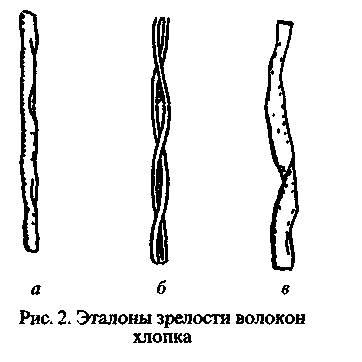 Рисунок 2. Эталоны зрелости хлопкового волокна: а) перезрелое, б) зрелое, в) незрелое.
