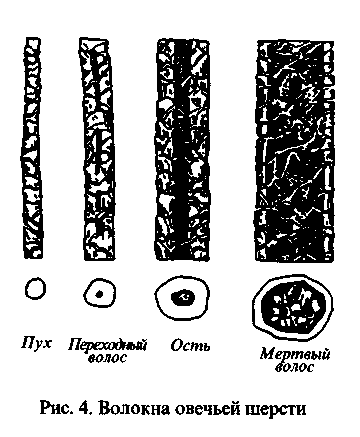 Рисунок 4. Основные типы волокон шерсти: пух, переходный волос, ость, мертвый волос.