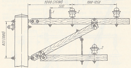 Рис. 84. Деревянная консоль для ВЛ 6–10 кВ. Размеры в скобках соответствуют удлиненным типам.