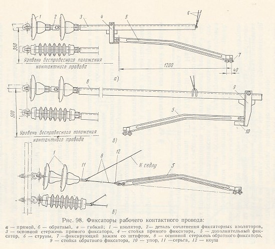 Фиксаторы рабочего контактного провода. Фиксаторы рабочего контактного провода составляют основную массу применяемых устройств. Современные конструкции выполняются сочлененными, что минимизирует негативное влияние на качество токоснимания. Вес основных деталей передается на опорные устройства, а с проводом связан лишь легкий дополнительный фиксатор. Такое решение существенно улучшает динамическое взаимодействие. Основными компонентами являются основной стержень, стойка, дополнительный фиксатор и фиксаторный изолятор.