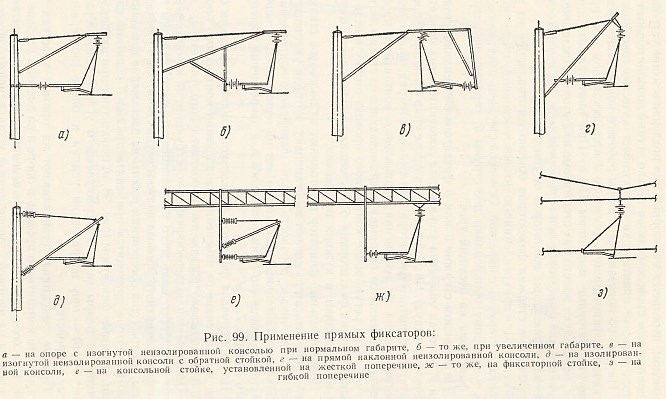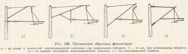 Для изоляции при постоянном токе традиционно применяют фиксаторные изоляторы типа Н-4,5, а при повышенных нагрузках или на переменном токе – стержневые изоляторы. Основной стержень, изготавливаемый из угловой стали, через ушко и две струны передает нагрузку на несущий трос. На нем закреплена стойка с ушками для дополнительного фиксатора и упором, предотвращающим раскрытие конструкции при ветре. Легкий дополнительный фиксатор из полосовой стали шарнирно крепится к стойке и оканчивается скобой для фиксирующего зажима.