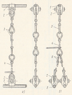Рис. 101. Звеньевые струны цепных подвесок: а — для одиночного контактного провода, б — для двойного контактного провода; 1 — несущий трос, 2 — струновой зажим, 3 — нерегулируемое звено, 4 — регулируемое звено, 5 — контактный провод, 6 — нижнее звено для двойного контактного провода