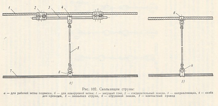 Конструкция скользящей струны для рабочей ветви (рис. 102, а) основана на обычной звеньевой струне, но с возможностью свободного перемещения вдоль троса. В качестве направляющей используется стальной пруток, закрепленный на несущем тросе двумя зажимами. Верхнее крепление струны заменено медной скобой, скользящей по направляющей, а нижнее выполнено стандартным струновым зажимом. На нерабочей ветви (рис. 102, б) скользящая струна крепится к контактному проводу также при помощи скобы, что упрощает монтаж и обеспечивает необходимую свободу перемещений.