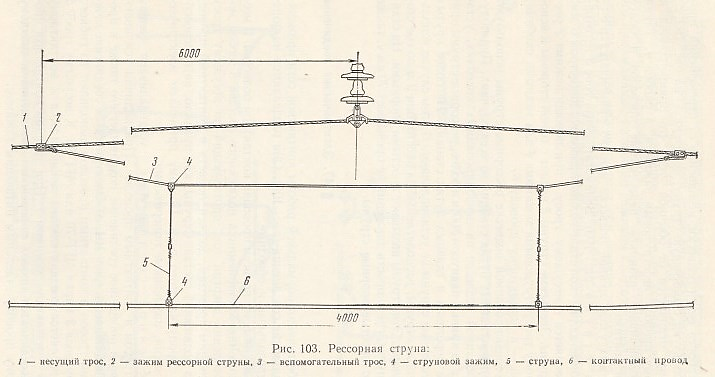 В опорных узлах подвески широко используются рессорные струны (рис. 103). Их ключевым элементом является вспомогательный трос из биметаллической сталемедной проволоки, который крепится к несущему тросу специальным зажимом. К этому вспомогательному тросу с помощью зажимов или скоб крепятся обычные звеньевые струны, соединенные с контактным проводом. Такая конструкция повышает эластичность подвески в зоне жесткого крепления к опоре.