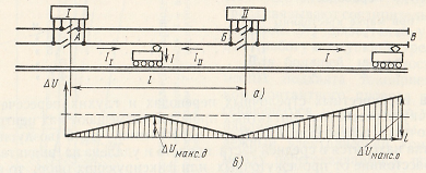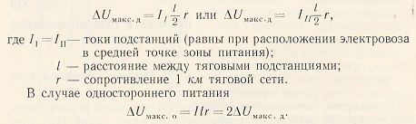 Двустороннее питание повышает надежность, снижает токовую нагрузку на подстанции и провода, уменьшает падение напряжения и потери энергии. Для сравнения, при одностороннем питании падение напряжения на токоприемнике электровоза может быть вдвое выше. Это объясняется распределением общего тока I между двумя подстанциями: I = I₁ + I₂. Максимальное падение напряжения при двустороннем питании (рис. 107, б) рассчитывается как: