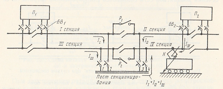 На посту устанавливаются быстродействующие выключатели (БВ), соединенные с общей шиной. Контактная сеть разделена на секции воздушными промежутками. При включенных БВ сеть соединяется в узловую схему питания. Пост обеспечивает селективную защиту: при коротком замыкании в точке K отключаются только ближайшие БВ (например, БВ2 подстанции П2 и БВ4 поста), обесточивая лишь часть секции, а не весь путь.