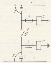 Рис. 111. Принципиальная схема пункта параллельного соединения постоянного тока: 1, 1' — контактные подвески; 2, 2' — гирлянды изоляторов; 3, 3' — съемные перемычки; 4, 4' — высоковольтные предохранители; 5, 5' — реле напряжения; 6 — разъединитель с моторным приводом.