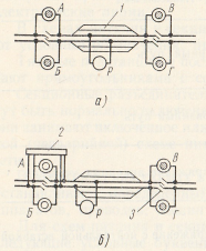 Рис. 112. Схемы секционирования контактной сети на двухпутном участке при переменном и постоянном токе без тяговых подстанций: а — без поста секционирования, б — с постом секционирования; 1 — станция, 2 — пост секционирования, 3 — изолирующее сопряжение; А, Б, В. Г и Р — секционные разъединители