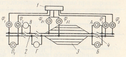 Рис. 113. Схема питания и секционирования железнодорожной станции в случае расположения на ее территории тяговой подстанции переменного тока: 1 - тяговая подстанция, 2 — нейтральная вставка, 3 — станция, 4 — изолирующее сопряжение; А, Б, В, Г, П1, Ф1, Ф2, Ф4, Ф5, Ф31 и Ф32 — разъединители контактной сети