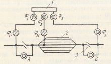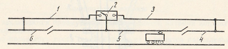 Рис. 115. Схема стыкования участков постоянного и переменного тока с переключаемой секцией (5) контактной сети на станции: 1 — питающая линия постоянного тока, 2—переключатель, 3 — питающая линия переменного тока, 4 — контактная сеть