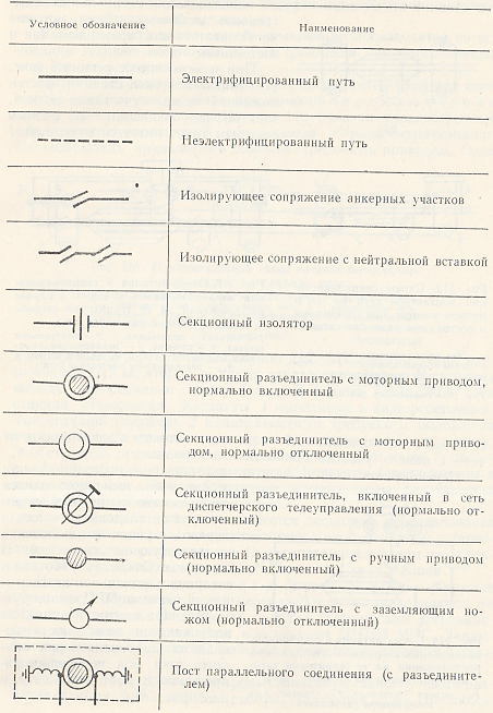 Таб. 11. Условные обозначения, применяемые в схемах питания и секционирования контактной сети