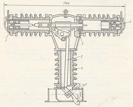 Рис. 116. Малогабаритный переключатель контактной сети завода «Уралэлектротяжмаш». 1 – розеточные контакты, 2 – токоведущий стержень, 3 – изолирующая тяга, 4 – опорный изолятор, 5 – дугогасительные камеры.