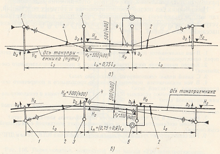 Рис. 117. Схемы изолирующих сопряжений анкерных участков на прямом (а) и кривом (б) участках пути. Толстая линия – рабочие ветви подвески, тонкая – нерабочие. Размеры без скобок относятся к переменному току, в скобках – к постоянному: а — на прямом участке пути, б — на кривом; 1 — анкерная опора, 2 — электрическое соединение, 3 — переходная опора, 4 — врезные изоляторы, 5 — секционным разъединитель; Н0 — высота контактного провода над головкой рельса в данном месте, b0 — зигзаг контактного провода от оси токоприемника, L0 — длина промежуточного пролета, Lп — длина переходного пролета