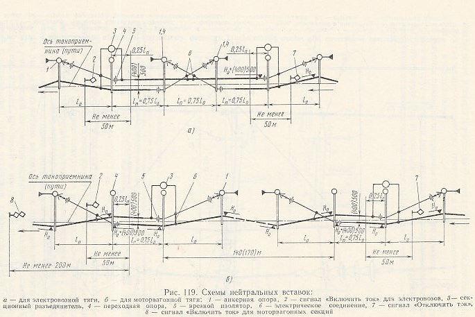 Рис. 119. Схемы нейтральных вставок для электровозной (а) и моторвагонной (б) тяги.