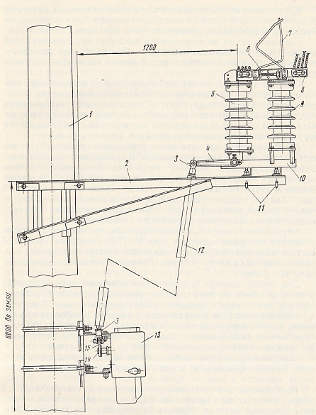 Рис. 123. Установка разъединителя постоянного тока с моторным приводом: 1 – опора; 2 – кронштейн; 3 – шарнирное ушко; 4 – рычаг изолятора; 5 – подвижный изолятор; 10 – опорная рама; 11 – крюковой болт; 12 – вал; 13 – моторный привод УМП-П; 15 – рычаг привода.
