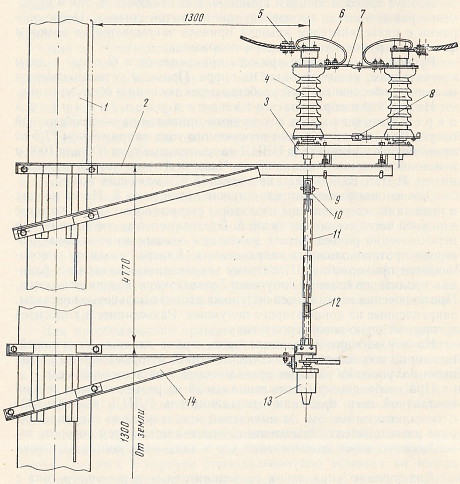Рис. 124. Установка разъединителя переменного тока с ручным приводом: 3 – рама; 4 – стержневой изолятор; 5 – контактный вывод; 6 – гибкий проводник; 7 – главный полунож; 8 – тяга; 10, 12 – соединительные муфты; 11 – вал; 13 – ручной привод ПРНЗ-35М.