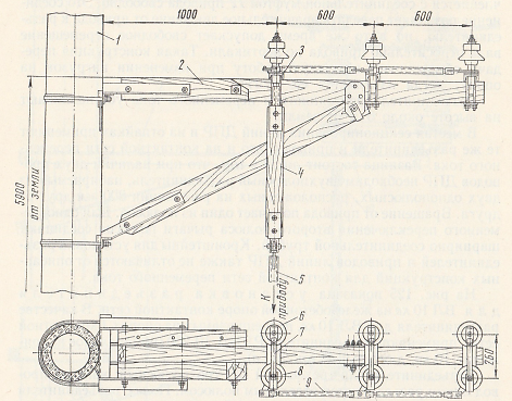 Рис. 125. Установка разъединителя ВЛ 10 кВ на опоре контактной сети: 3 – рама полюса; 4 – изолирующая вставка; 5 – вал; 6 – неподвижный изолятор; 7 – нож; 8 – поворотный изолятор; 9 – соединительная труба.