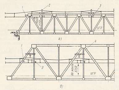 Рис. 130. Схемы прохода контактной подвески на мостах с ездой понизу: а — несущий трос сверху моста, б — несущий трос внутри моста; 1 — отбойник, 2 — кронштейн, 3 — фиксатор, 4 — дополнительный кронштейн; У ГР — уровень головки рельсов.