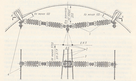 Как показано на рис. 132, несущий трос (3) крепится к гирлянде, состоящей из двух стержневых изоляторов (1) на сторону в сетях переменного тока и одного — при постоянном токе. Контактные провода (2), как правило, два, подвешиваются на коротких скользящих струнах и на прямых участках не фиксируются. В тоннелях большой протяженности преимущественно монтируется полукомпенсированная цепная подвеска. На кривых участках возникает необходимость фиксации проводов, для чего используются изолированные консоли, что требует несколько увеличенных габаритов тоннеля. В качестве заземляющего устройства применяются тросы группового заземления (4).