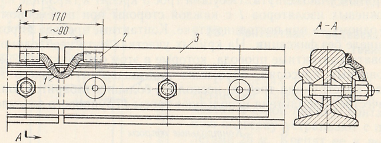 Рис. 133. Стыковой электрический соединитель: 1 — соединитель, 2 — поверхность контакта, 3 — рельс.