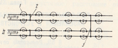 На электрифицированных участках, не оборудованных устройствами автоблокировки и централизации (рис. 134), применяется стандартная схема монтажа соединителей. Стыковые соединители (1) устанавливаются на всех стыках, междурельсовые (2) — через каждые 300 метров, а междупутные (3) — через 600 метров на станциях и через 1200 метров на перегонах. Данная схема обеспечивает минимальное сопротивление для тягового тока.