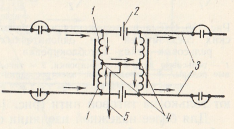 Путевой дроссель-трансформатор (рис. 135) представляет собой аппарат с замкнутым магнитопроводом и обмоткой (1), размещенный в маслозаполненном корпусе. Его обмотка подключена к рельсам (3) по обе стороны от изолированного стыка (2), а средние точки (4) соседних дросселей соединены между собой. Тяговый ток, протекая по встречно включенным полуобмоткам, создает компенсирующие магнитные потоки, поэтому аппарат оказывает ему лишь малое омическое сопротивление.