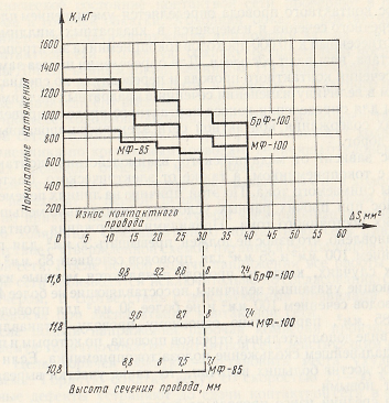 Рис. 191. Ступени регулирования натяжения контактного провода в зависимости от износа. Диаграмма показывает снижение натяжения (в кГ) при увеличении износа (в мм² и по высоте оставшегося сечения). Например, для провода МФ-100 номинальное натяжение 1000 кГ поддерживается до износа в 15 мм² (9,6 мм по высоте), после чего оно снижается на 100 кГ.