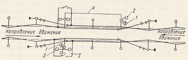 Рис. 196. Сигнальный указатель перед воздушным промежутком для предупреждения пережога проводов: 1 — сигнальные указатели «Опустить токоприемник», 2 — релейный шкаф, 3 — датчик, 4 — низковольтная линия.