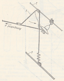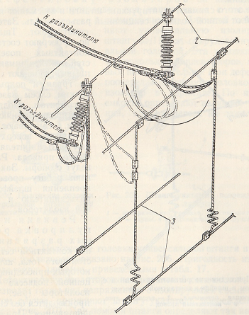Рис. 205. Роговой разрядник на контактной сети постоянного тока.