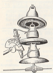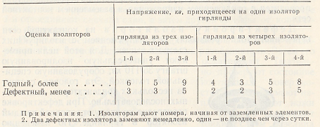 Дефектировку изоляторов на сети переменного тока выполняют под напряжением с вышки, используя универсальную изолированную штангу 35/110 кВ со специальной емкостной головкой (рис. 206). Последовательно шунтируя каждый изолятор в гирлянде, по распределению напряжения определяют их состояние в соответствии с данными таблицы 17.