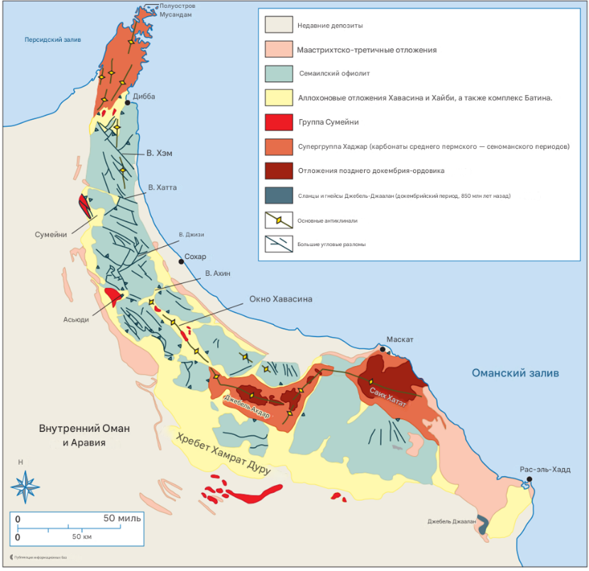 Геологическая карта Омана. Крупнейший в мире офиолит Семайл показан зеленым цветом.