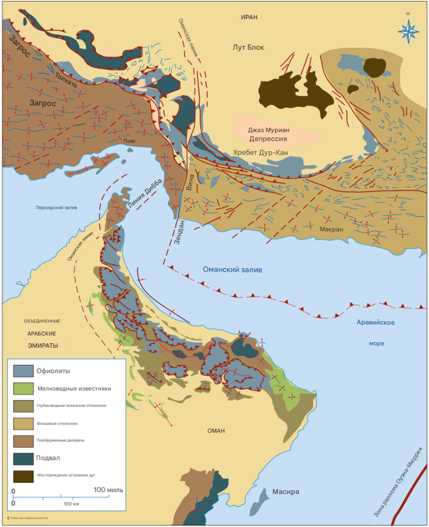 Окончательное континентальное столкновение Аравийской и Иранской плит началось в миоцене. Это объясняет фундаментальные литологические различия между соседними поясами. Южный Загрос сложен преимущественно складчатыми осадочными толщами Аравийской платформы, деформированными с миоцена. В свою очередь, Макран представляет собой аккреционный клин – призму деформированных океанических отложений, соскобленных с погружающейся плиты.