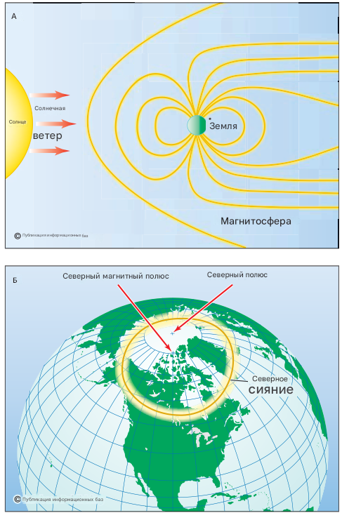 Рисунок 1 (А): Схема магнитосферы, демонстрирующая её асимметричную форму, которая формируется под давлением солнечного ветра, искажающего магнитное поле Земли. Рисунок 1 (Б): Земля с изображением типичного аврорального овала, где интенсивность сияний максимальна на расстоянии 20-30° от магнитного полюса, в зоне наибольшей концентрации силовых линий.