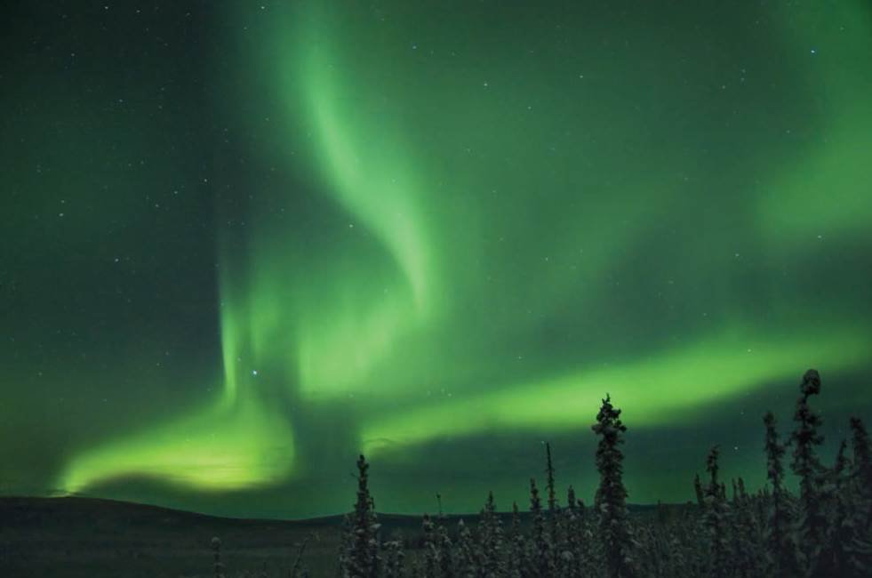 Активная северная полярная дуга, зафиксированная на Аляске. Динамичные формы и интенсивное свечение характерны для периодов геомагнитных возмущений.