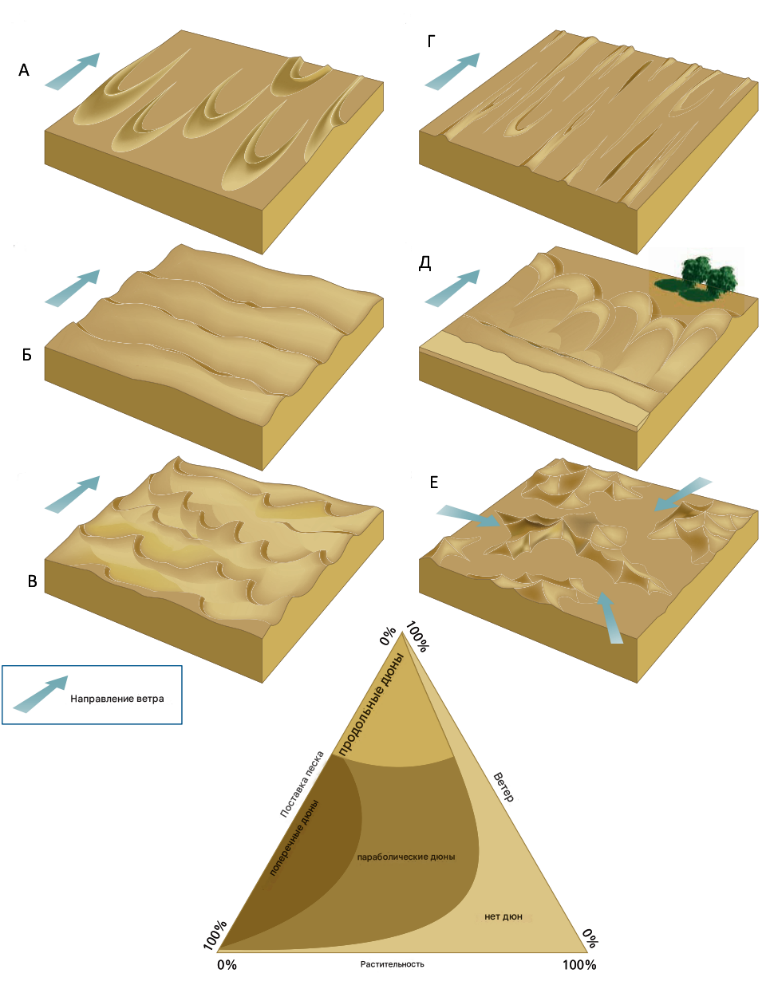 Структурная схема типов дюн, включая (А) барханные, (Б) поперечные, (В) барханоидные, (Г) линейные, (Д) параболические и (Е) звездообразные. График (треугольный) показывает, какие типы дюн образуются при различных условиях ветра, поступления песка и растительного покрова.