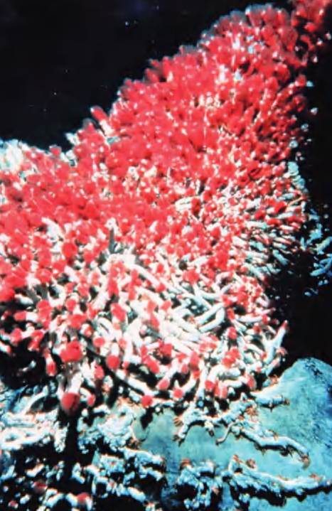 Иллюстрация экосистемы «Черного курильщика» на Восточно-Тихоокеанском поднятии. На изображении показаны гигантские трубчатые черви (Riftia pachyptila), колонизирующие основание дымохода, что демонстрирует симбиоз геологических и биологических процессов в полной изоляции от солнечного света.