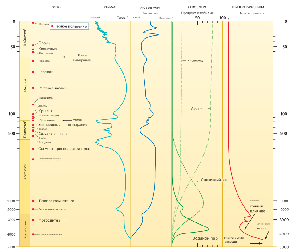Графики, демонстрирующие корреляцию изменений концентраций CO₂, O₂ и глобальной температуры в геологической истории (по данным исследований Кента Конди и Роберта Слоуна).