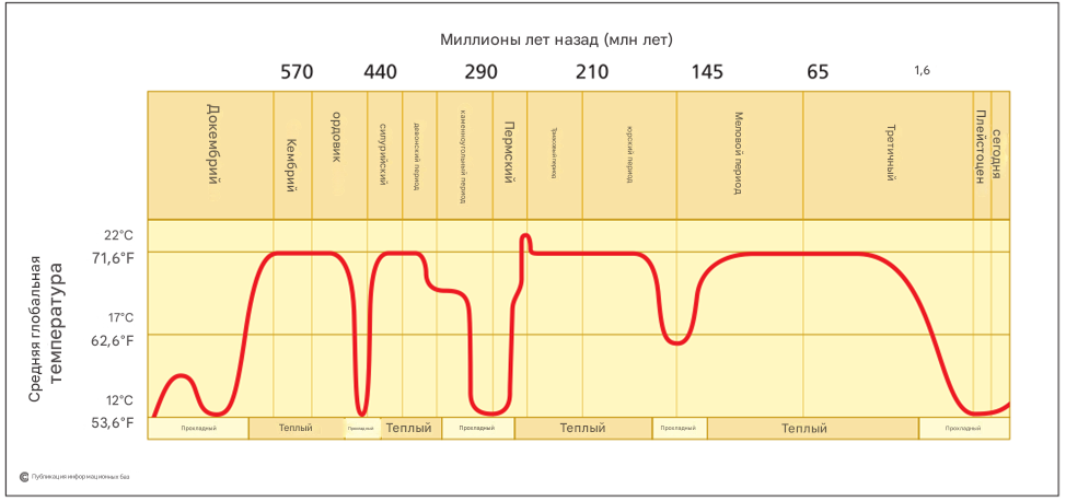 График, иллюстрирующий колебания средней температуры поверхности Земли на протяжении последних 500 миллионов лет, с указанием основных ледниковых и парниковых периодов. Рисунок 1. Долгосрочная (палеоклиматическая) изменчивость глобальной температуры.