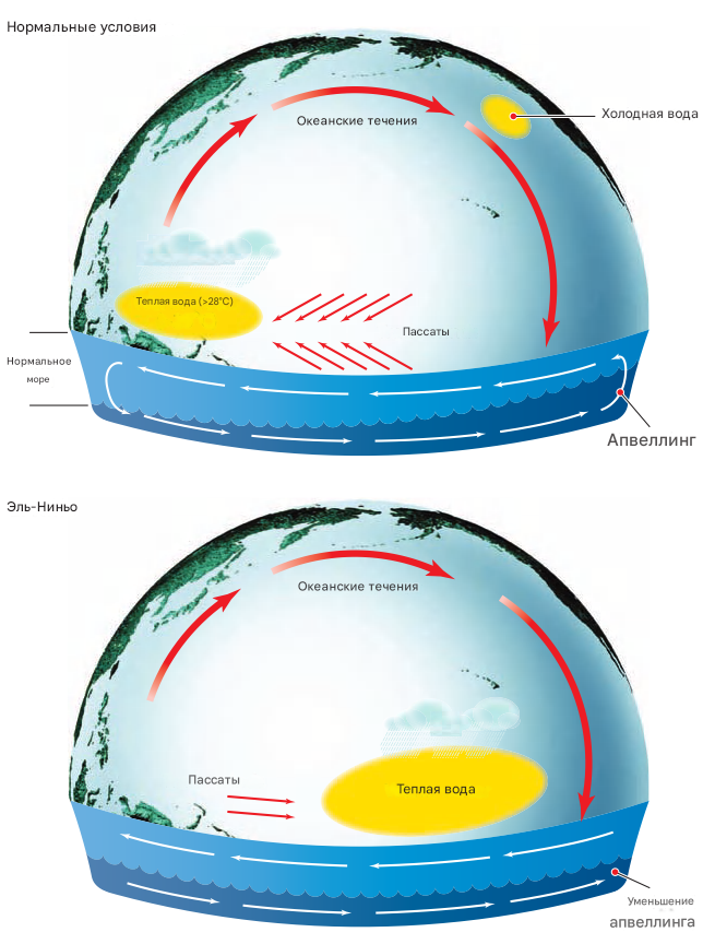Атмосферный отклик на это изменение известен как Южное колебание — крупномасштабное перераспределение давления между западной и восточной частями Тихого океана. Восходящие потоки с дождями смещаются в центральную и восточную акваторию, в то время как над Индонезией и Австралией устанавливается сухая погода. Это приводит к экологическим катастрофам: подавление апвеллинга губит популяции рыб, а проливные дожди вызывают наводнения в обычно засушливых регионах Перу и Чили.