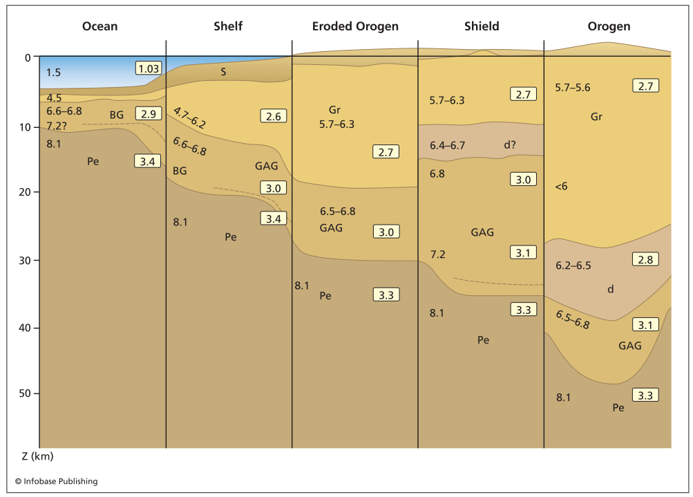 Общая структура земной коры различных провинций, определенная сейсмологическими методами. Цифры в квадратиках обозначают плотность в граммах/см³, а другие цифры обозначают сейсмическую скорость P-волн в километрах в секунду: BG = базальт-габбро, GAG = амфиболит и гранулит, Pe = перидотит, d = диорит, An Ga = анортозитовое габбро, S = отложения, Gr = гранит-гнейс верхняя часть земной коры, M = разрыв Мохоровичича.