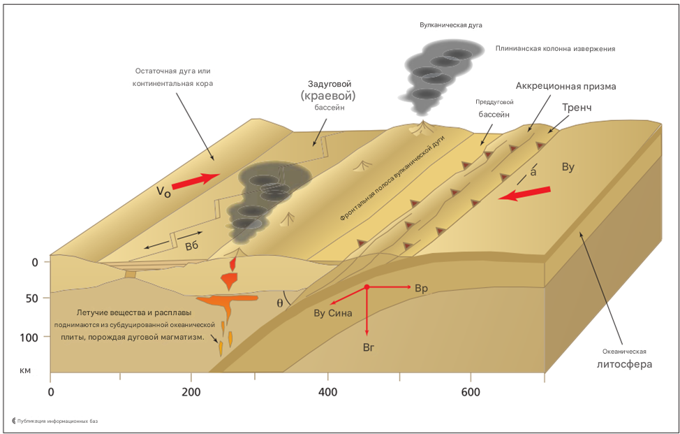 Вариативность дуговых процессов определяется относительными векторами сближения плит. В кинематических моделях активная вулканическая дуга соответствует изобате ~110 км на погружающейся плите. Наклонное схождение и компонента сдвига, а также откат плиты, зависящий от её возраста, определяют, будет ли происходить растяжение или сжатие в верхней плите. Эта модель объясняет весь спектр от растягивающих до сжимающих дуг.