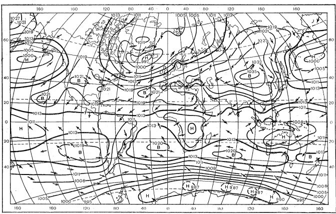 Зона повышенного давления на широтах 30—35° особенно хорошо выражена над океанами, над которыми она удерживается в течение всего года. Над материками такая зона сохраняется только зимой. Летом вследствие значительного прогревания материков эта зона распадается на отдельные барические максимумы, которые сохраняются только над океанами и несколько смещаются к северу по сравнению со своим зимним положением. Центры субтропических антициклонов летом, как и зимой, располагаются у Азорских и Гавайских островов, но северные их периферии распространяются на умеренные широты. Так, гребень (отрог) азорского антициклона распространяется не только на север, но и далеко на восток. Он захватывает не только Южную и Центральную Европу, но и юг европейской части Советского Союза.