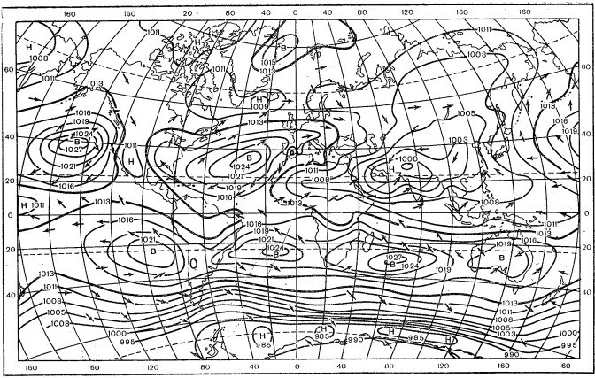 Рис. 3.8. Поле давления и система воздушных течений на уровне моря в январе