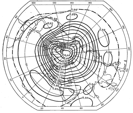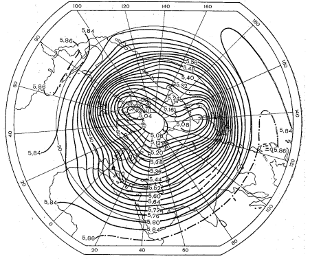 С высотой, как уже указывалось, поле давления становится более гладким, что наглядно видно при сопоставлении распределения среднего многолетнего давления на уровне моря (см. рис. 3.8 и 3.9) и средних месячных карт АТ500 (рис. 3.10 и 3.11). Вместо замкнутых областей высокого и низкого давления на уровне моря в умеренных широтах можно видеть лишь волнообразные изгибы изогипс.